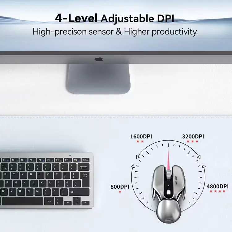 ماوس فلزی بیسیم GREEN LION Beetles G266 با پشتیبانی از چهار سطح DPI (800، 1600، 3200 و 4800) به شما اجازه میدهد تا سرعت و دقت نشانگر را متناسب با نیاز خود تنظیم کنید؛ چه برای کارهای روزمره، چه طراحی گرافیکی یا حتی بازی. شتاب 10G و نرخ تازه سازی 125 هرتز، تجربهای سریع و بدون تاخیر ارائه میدهند و دقت حرکت ماوس را در بالاترین سطح نگه میدارند.