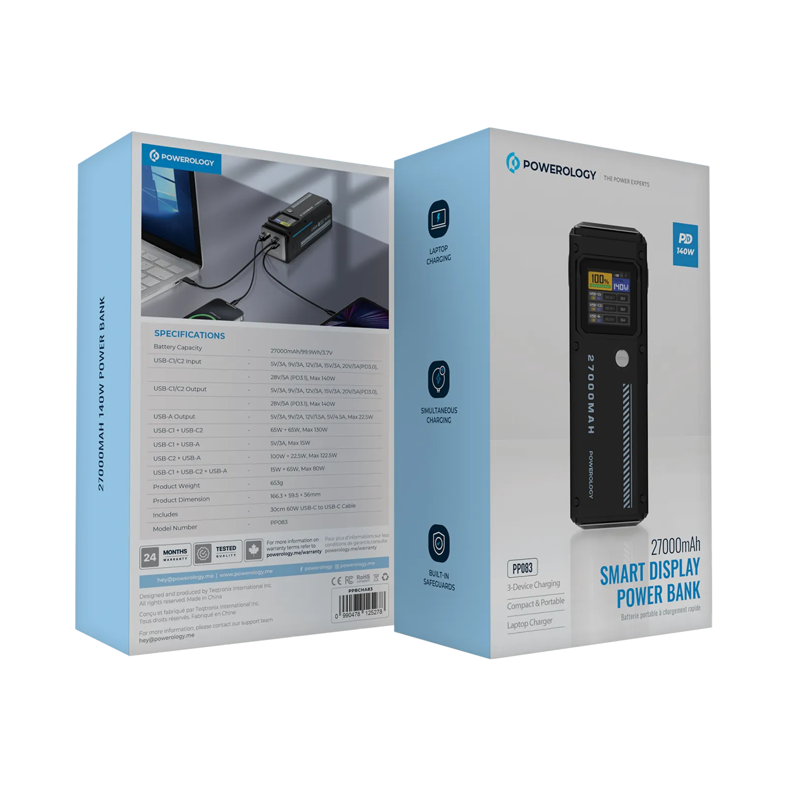 پاوربانک Powerology 27000mAh Smart Display یک شارژر قابل حمل با کارایی بالا است که برای رفع تمام نیازهای شما به برق، چه در خانه، چه در محل کار و چه در حال حرکت، طراحی شده است. با ظرفیت قدرتمند 27000 میلیآمپر ساعت و توان 99.9 وات ساعت ، شارژ ماندن دستگاههای شما را برای مدت طولانیتری تضمین میکند. این پاوربانک از شارژ سریع با دستگاههای PD 3.0 و PD 3.1 پشتیبانی میکند و تا 140 وات توان برای ورودی و خروجی USB-C1/C2 ارائه میدهد.