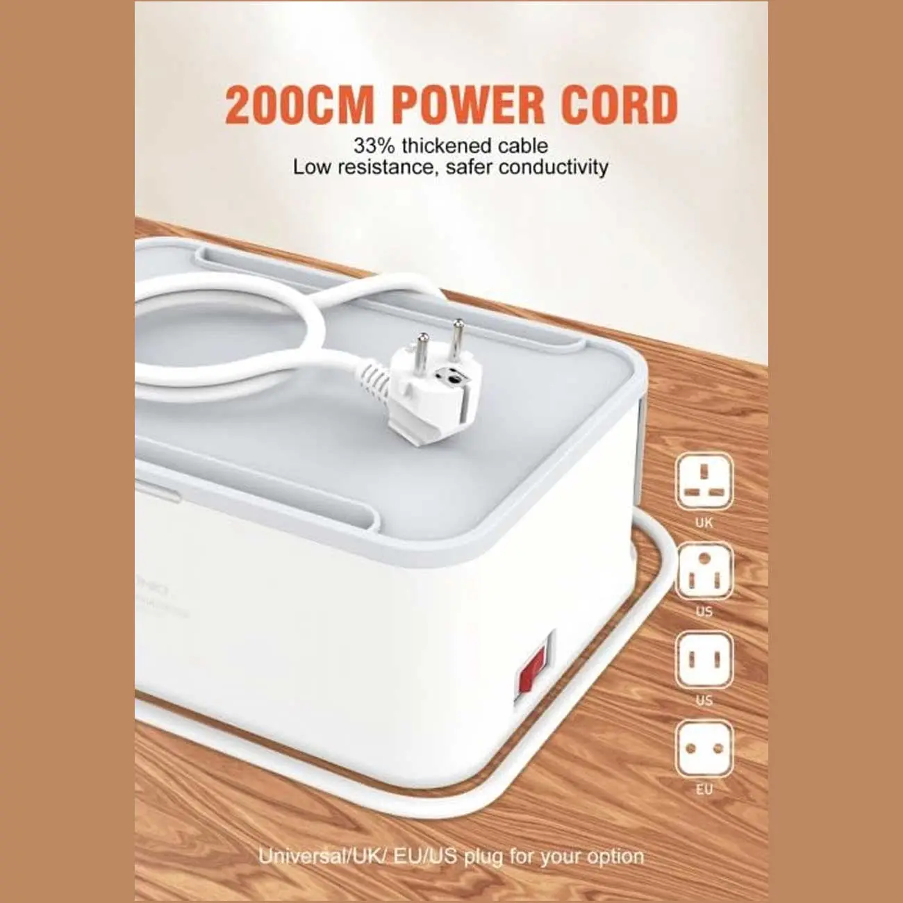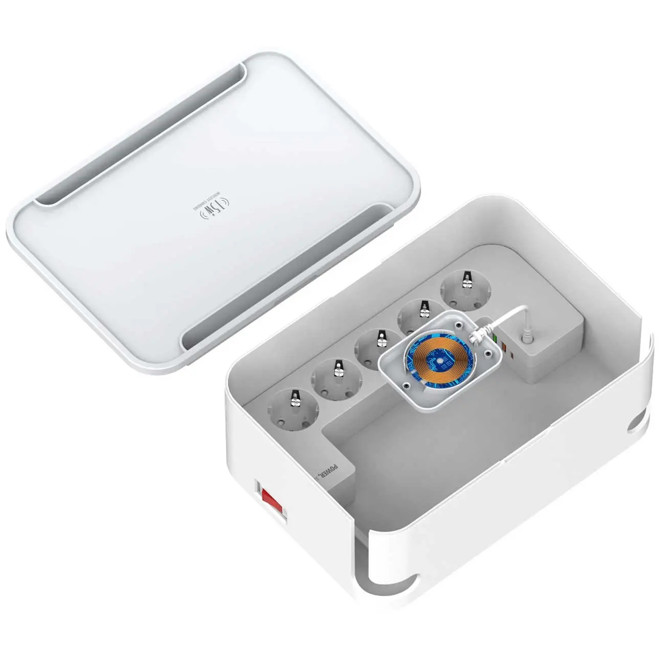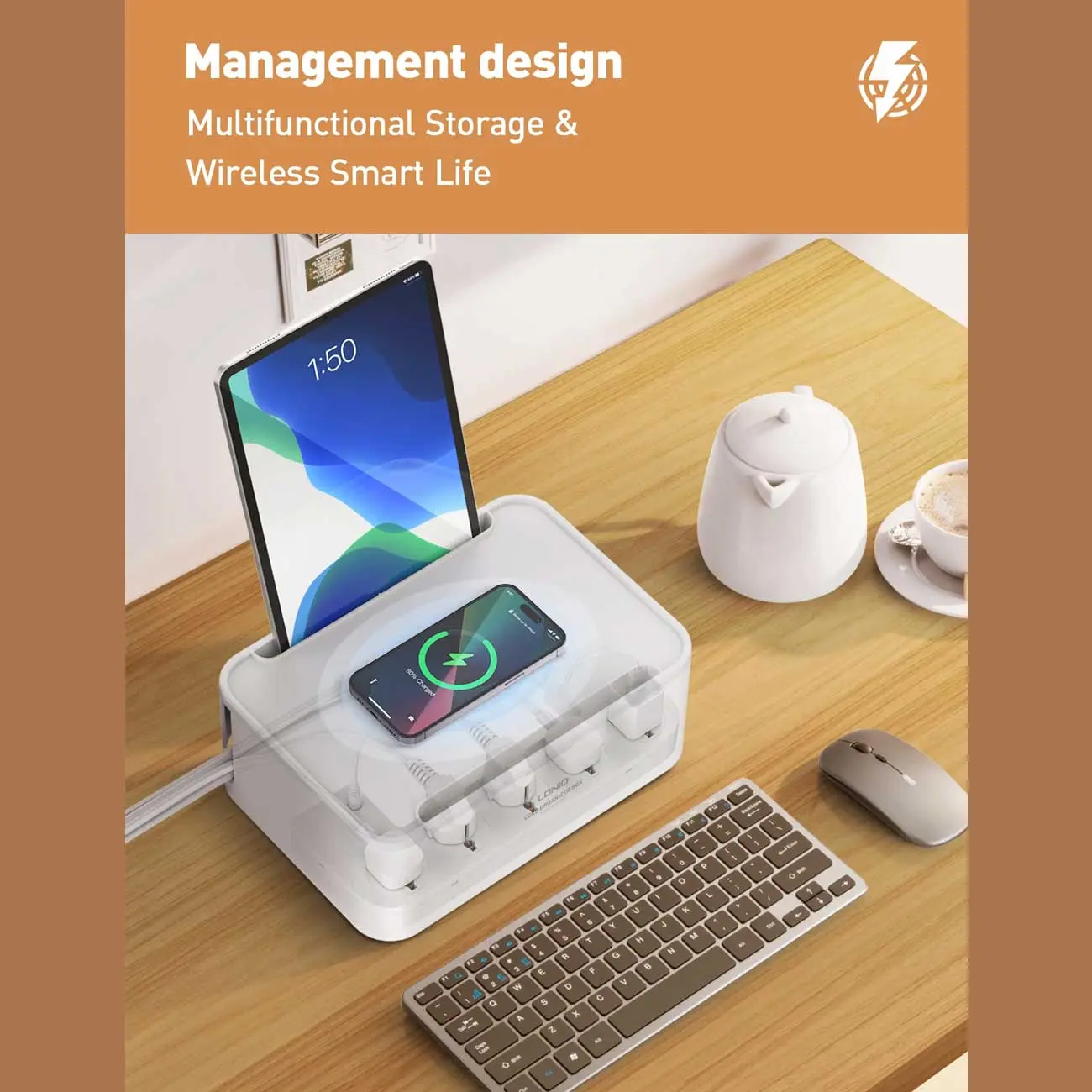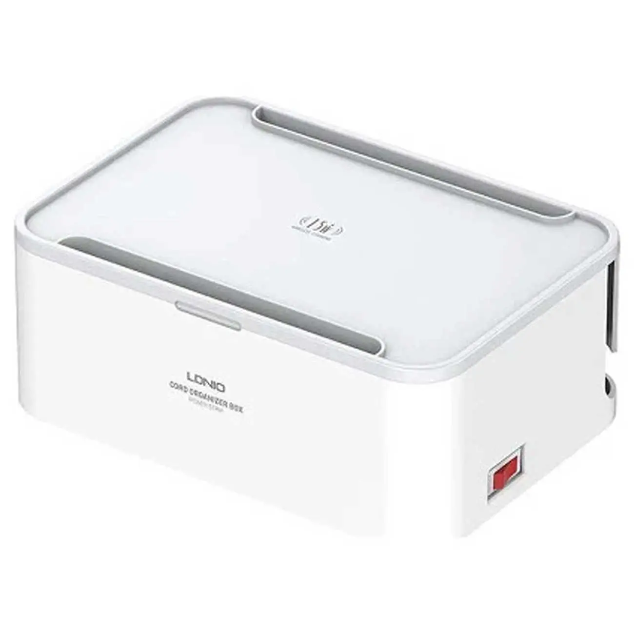 مهمترین ویژگی چند راهی برق الدینیو SN5310W که در نگاه اول به چشم شما میخورد، وجود یک جعبه دور پریزها و پورتهای شارژ است. وجود این باکس کمک میکند که دیگر سیمهای دستگاههای مختلف در محیط زندگی شما پخشوپلا نباشد. در نتیجه نه سیمها و دوشاخهها آسیب میبینند و نه فضای خانه شما شلوغ و بینظم میشود. دو شیار L مانند نیز در دو گوشه بدنه این دستگاه قرار گرفته که کمک میکند بتوانید سیمهای برق را از آن عبور کنید و به شکلی منظم از آنها استفاده کنید. بر روی در این باکس نیز یک شیار وجود دارد که میتوانید آیپد و یا گوشی خود را از ان عبور داده و گوشی خود را داخل باکس به شارژ بزنید. در قسمت بالای باکس نیز یک پد شارژ وایرلس وجود دارد که برای گجتهای متنوعی مانند گوشی آیفون و اپل واچ قابل استفاده است.