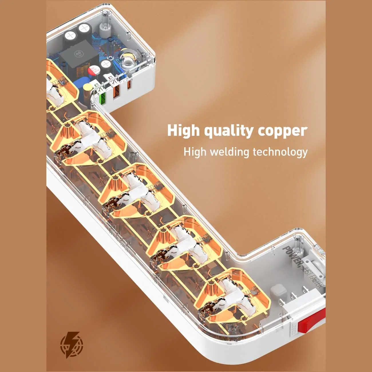 طراحی شیک و منحصربهفرد چند راهی برق و شارژر LDNIO SN5310W یکی از ویژگیهای این شارژر است که در نگاه اول به چشم میخورد. 5 پریز برق EU، دو پورت USB، یک پورت Type-c و خروجی شارژ وایرلس روی این شارژر قرار گرفته است. پریزهای برق روی این چند راهی نیز از نوع یونیورسال بوده و با انواع دو شاخهها سازگار است. همچنین دکمه خاموش و روشن به رنگ قرمز بر روی بدنه این شارژر قرار گرفته است. در ساخت این چندراهی از پلاستیک بسیار باکیفیت پلی کربنات ساخته شده که تا حرارت 850 درجه مقاوم است. همچنین این چندراهی مجهز به کابل 2 متری بسیار باکیفیت و ضخیم است که استفاده از آن را بسیار ساده میکند. همچنین در داخل این چندراهی از قطعههای با آلیاژ طلایی استفاده شده تا رسانایی و کیفیت انتقال برق بهبود زیادی پیدا کند.