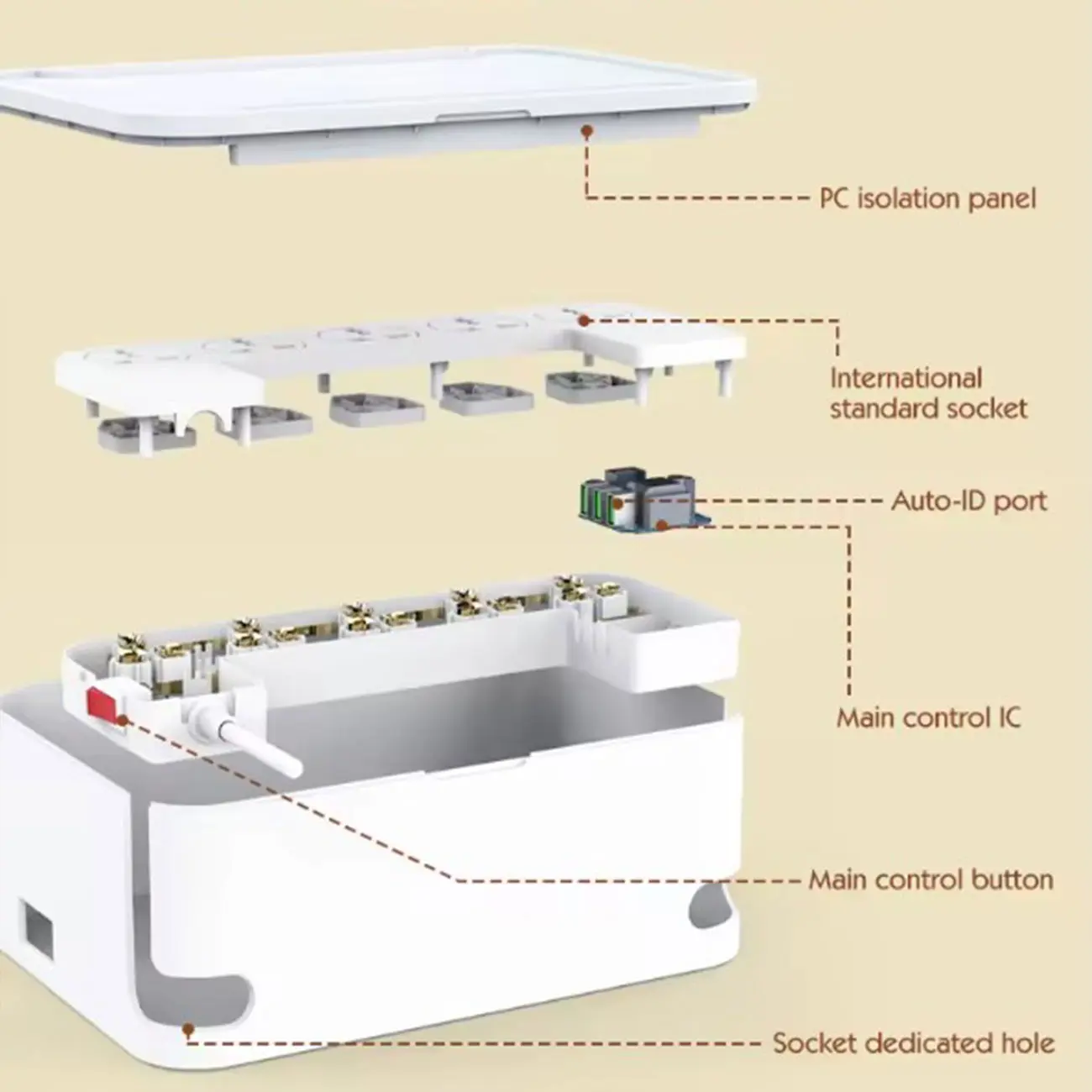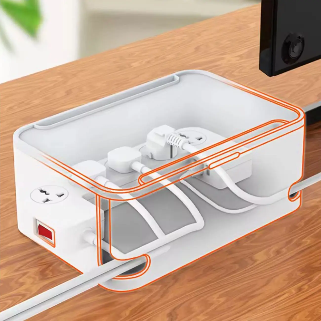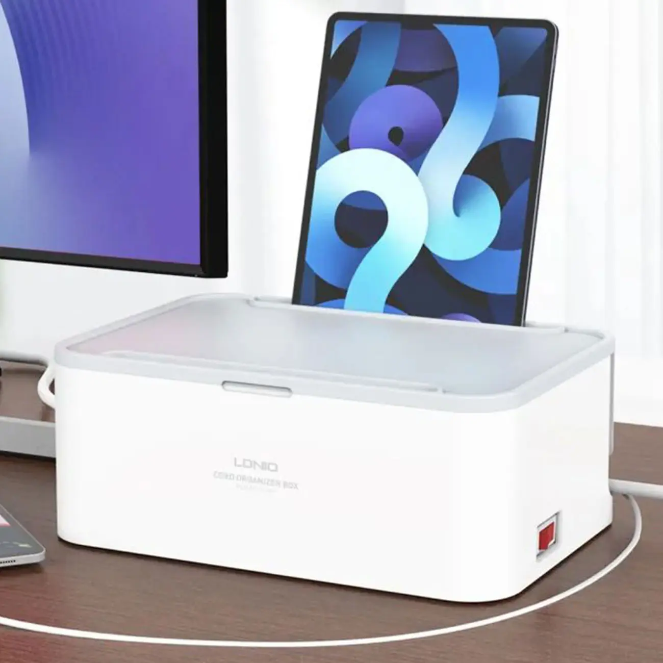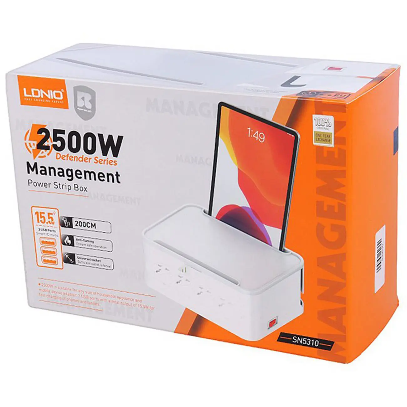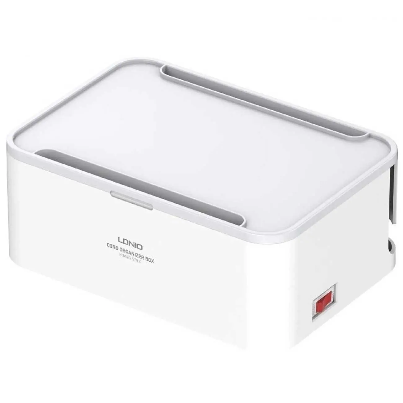 مهمترین ویژگی چند راهی برق الدینیو SN5310 که در نگاه اول به چشم شما میخورد، وجود یک جعبه دور پریزها و پورتهای شارژ است. وجود این باکس کمک میکند که دیگر سیمهای دستگاههای مختلف در محیط زندگی شما پخشوپلا نباشد. در نتیجه نه سیمها و دوشاخهها آسیب میبینند و نه فضای خانه شما شلوغ و بینظم میشود. دو شیار L مانند نیز در دو گوشه بدنه این دستگاه قرار گرفته که کمک میکند بتوانید سیمهای برق را از آن عبور کنید و به شکلی منظم از آنها استفاده کنید. بر روی در این باکس نیز یک شیار وجود دارد که میتوانید آیپد و یا گوشی خود را از ان عبور داده و گوشی خود را داخل باکس به شارژ بزنید.