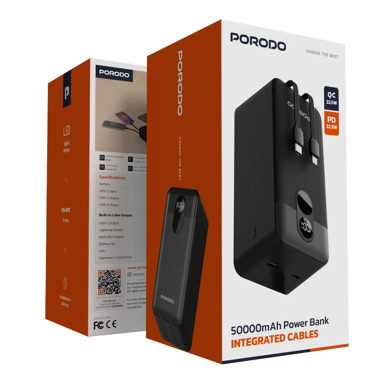 پاوربانک Porodo مدل PD-PBFCH061-BK یک شارژر همراه با ظرفیت بسیار بالا (۵۰۰۰۰ میلیآمپر ساعت) است که به همراه کابلهای داخلی (USB-C و Lightning) عرضه میشود. طراحی شده تا نیاز کاربرانی که چند دستگاه دارند یا در سفر و مواقعی که دسترسی به برق محدود است، محافظت کافی انرژی داشته باشند. دارای نمایشگر دیجیتال وضعیت باتری، چند درگاه خروجی، همچنین توان مناسب برای شارژ سریع دستگاههاست.