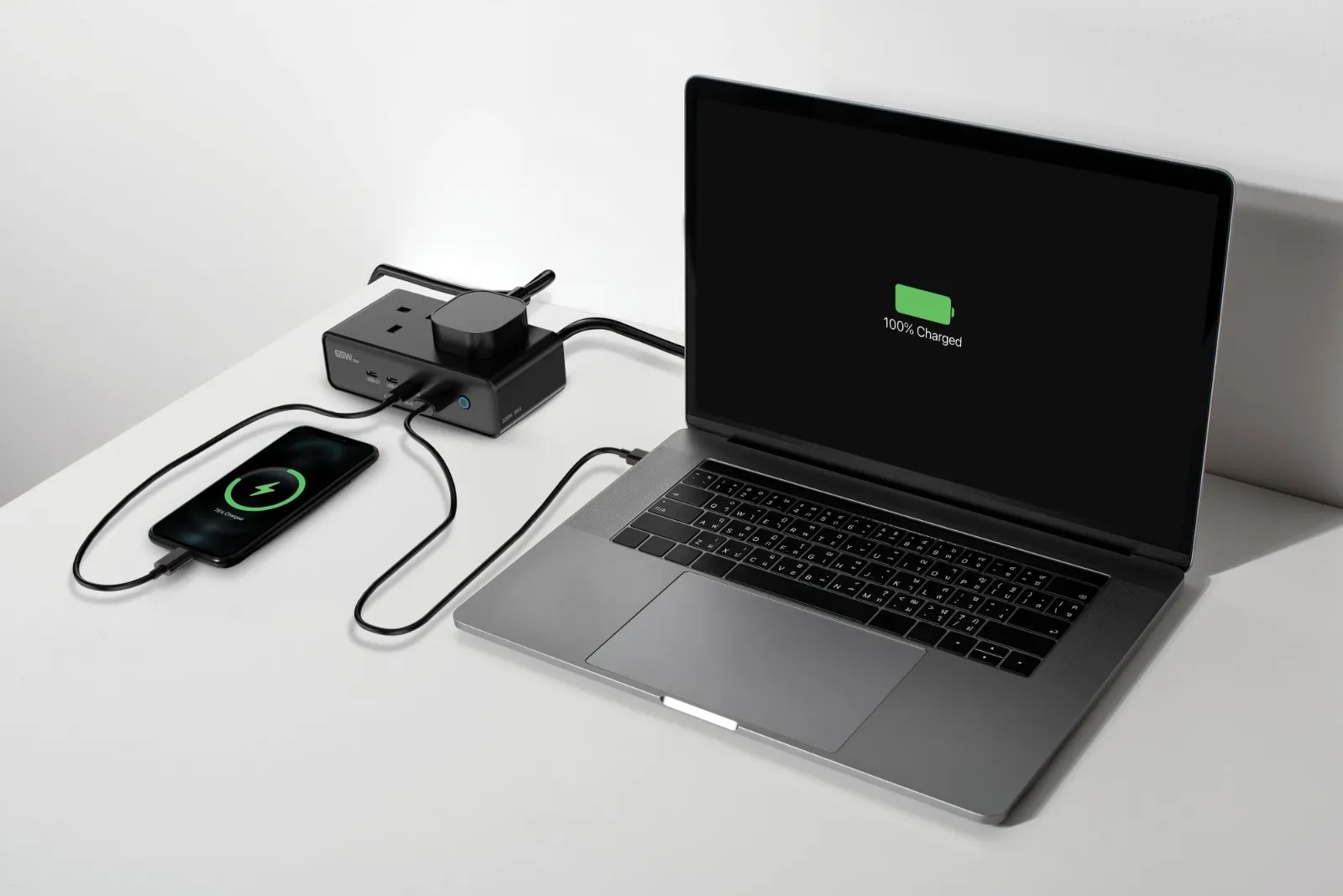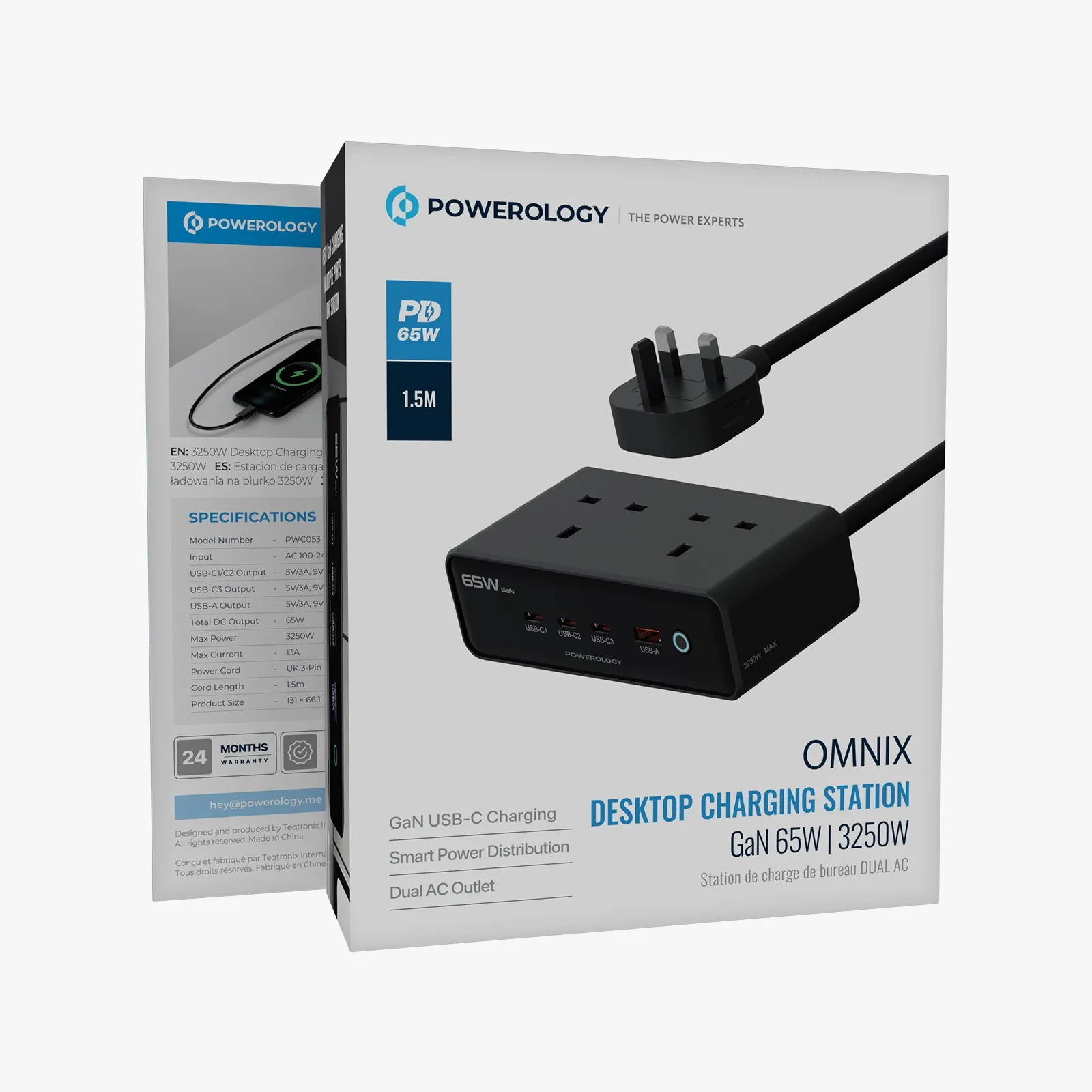 ایستگاه شارژ رومیزی Powerology Omnix GaN 65 وات | 3250 وات یک دستگاه شارژ قدرتمند با قابلیتهای متعدد است که میتواند تمامی دستگاههای شما را شارژ کند. این دستگاه با تنظیمات خروجی حداکثر 65 وات DC و توان حداکثر 3250 وات کار میکند تا لپتاپها، تلفنها، تبلتها و سایر تجهیزات الکترونیکی را بهسرعت شارژ کند. این دستگاه مجهز به چندین گزینه خروجی است: USB-C1/C2 (حداکثر 65 وات PD)، USB-C3 (حداکثر 20 وات) و USB-A (حداکثر 22.5 وات) با توزیع هوشمند انرژی برای بهینهسازی سرعت شارژ. فناوری GaN اجازه طراحی جمع و جور با بهرهوری، قابلیت اطمینان و ایمنی بالا را میدهد. با حفاظت در برابر جریان بیش از حد، گرمای بیش از حد و اتصال کوتاه، ایمنی دستگاه شما تضمین شده است. این دستگاه همچنین مجهز به دوشاخه ۳ پین UK با طول کابل حدود 1.5 متر است و برای استفاده در خانه یا دفتر مناسب است تا دستگاههای شما را با سرعت و ایمنی بالا شارژ کند و از ترکیبهای خروجی مختلف USB-C و USB-A پشتیبانی میکند.