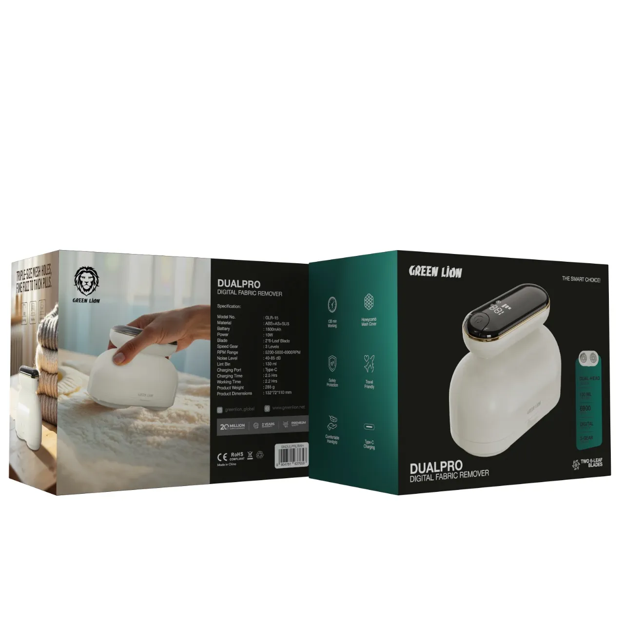 دستگاه پاککننده پارچه دیجیتال Green Lion DualPro دارای طراحی دو سر منحصر به فرد برای حداکثر کارایی در حذف پرز است. این دستگاه که از ABS، AS و SUS ساخته شده است، دارای دو تیغه شش برگی است که پرزها را به طور کارآمدی از بین میبرد.با سه تنظیم سرعت (5200-5800-6900 دور در دقیقه)، تمام قدرت دستی مورد نیاز شما را دارد، در حالی که سطح صدا از 40 تا 85 دسیبل است، زیرا در حین کار کاملاً بیصدا است. با زمان شارژ 2 تا 5 ساعت از طریق پورت Type-C، امکان کار مداوم 2.2 ساعت با باتری 1800 میلیآمپر ساعتی را فراهم میکند.محفظه پرز 130 میلیلیتری امکان کار طولانیتر قبل از خالی کردن را فراهم میکند. پوشش توری لانه زنبوری برای جمعآوری تمیز پرز، در حالی که یک دسته راحت و ویژگی ایمنی، سهولت در حین کار را تضمین میکند. صفحه نمایش دیجیتال شما را از وضعیت آن مطلع میکند و این دستگاه پاککننده پارچه را به یک وسیله ضروری برای مسافرت و عاری از پرز نگه داشتن لباسها تبدیل میکند.