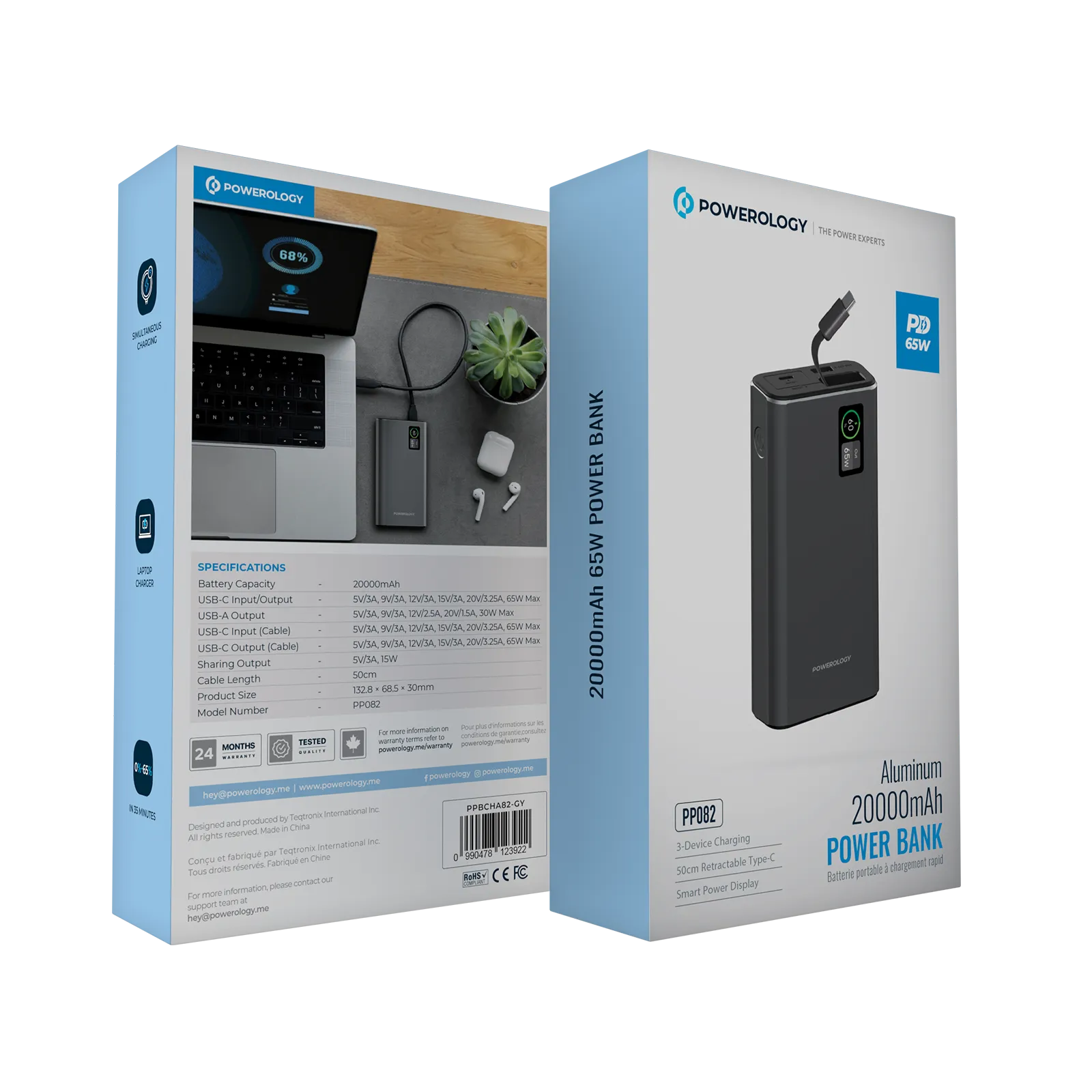 پاوربانک پاورولوژی PPBCHA82 ظرفیت ۲۰۰۰۰ میلیآمپر ساعت فست شارژ ۶۵ وات