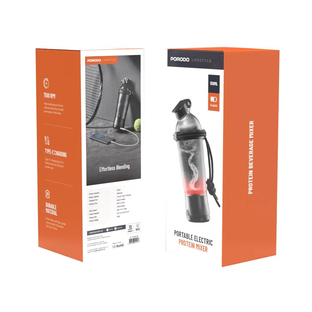 شیکر پروتئین شارژی قابل حمل پرودو مدل PD-LFPSKR با ظرفیت 550mlمجهز به مخزن 550 میلی لیتری، دارای موتور با قدرت گردش 7500 دور در دقیقهمدت زمان لازم جهت تامین انرژی حدود 2 ساعت، اقلام همراه شامل تبدیل OTG Type-C و کابل شارژمجهز به بند جهت سهولت در حمل و نقل، دارای استاندارد ایمنی و سلامت محصولات شامل CE / RoHSمجهز به کلید فیزیکی به منظور خاموش/روشن کردن، دارای درپوش پورت به جهت جلوگیری از ورود گرد و غباربدنه ساخته شده از جنس پلاستیک ABS، PP و Tritan، مقاوم در برابر ضربه و فشار احتمالی، دارای درب آسان نوشتامین انرژی از طریق باتری داخلی با ظرفیت 2000 میلی آمپر ساعت و شارژ مجدد از طریق درگاه تایپ سی و کابل همراه