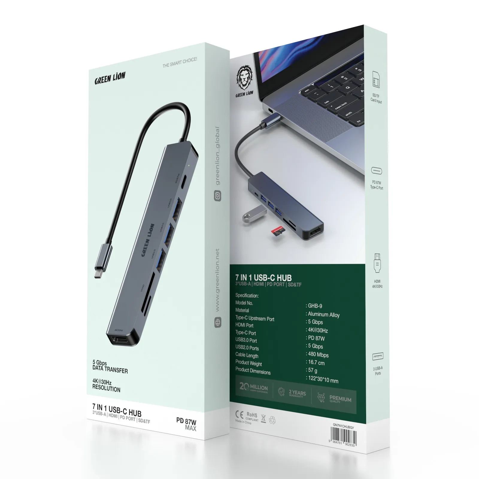 ویژگیهای کلیدی هاب 7 پورت تایپ سی گرین لاین Green Lion 7 in 1 USB-C Hub GHB-9 :