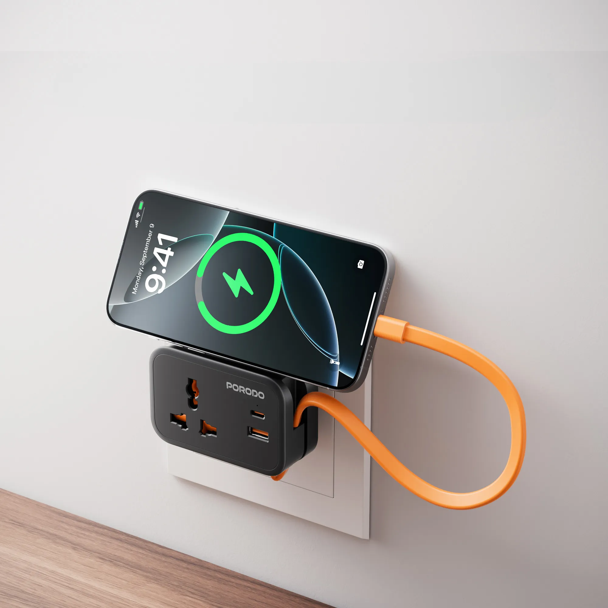 چندراهی Porodo مدل FWC056 دارای پریز AC یونیورسال است که انواع دو و سهپین رایج در کشورهای مختلف را پشتیبانی میکند. این یعنی اگر دستگاههایی با فیشهای متفاوت دارید یا سفر میکنید، این چندراهی نیاز شما را برای پریزها و وسایل مختلف برطرف میکند. علاوه بر آن، فضای بدنه نسبتاً جمع و جور است و طراحی مناسب آن باعث میشود بدون اشغال زیاد فضا قابل نصب باشد.
