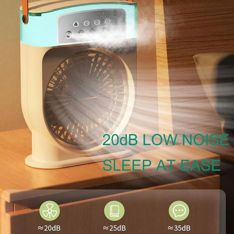 اگر به دنبال یک مه پاش و پنکه رومیزی و شارژی هستید ، این محصول مناسب شماست. این محصول از طراحی جمع‌وجور و قابل حمل بهره می‌برد و برای تولید هوایی مطبوع در روزهای گرم تابستان راهکاری جذاب به‌نظر می‌رسد. این پنکه مه پاش علاوه بر خنک کردن رطوبت محیط را نیز حفظ می کند. زیرا دارای مخزن آب با ظرفیت 600 میلی لیتر می باشد و موجب شده تا هوای ایجاد شده رطوبت خود را حفظ کرده و شما به راحتی تنفس کنید. شایان ذکر است در صورت گرما زیاد برای خنک شدن سریع میتوانید با افزودن تکه های یخ در مدت زمان کوتاه هوای محیط را دلچسب نموده و از هوای خنکی که ایجاد شده لذت ببرید. این پنکه دارای دکمه هایی است که می توانید سرعت باد را در سه درجه تنظیم کرده و مه پاش ها را به صورت تکی، سه تایی یا پنج تایی روشن کنید. همچنین دارای تایمر می باشد که می توان با روشن کردن آن، دستگاه بعد از مدت 1، 2 یا 3 ساعت به صورت اتومات خاموش شود. از دیگر قابلیت های این دستگاه می توان به چراغ خواب بودن آن اشاره کرد و شما میتوانید نور دلخواه خود را با دکمه مخصوص قرار گرفته شده روی بدنه محصول تنظیم کنید.این پنکه با سطح صدای کم به خنک کردن یا مرطوب کردن هوا در هر زمان از سال به خصوص فصل گرما کمک شایانی به شما می کند. برای تامین انرژی دستگاه یک پورت USB Type-C در قسمت پشتی در نظر گرفته شده است که می‌توان آن را مستقیم به یک آداپتور شارژ سازگار متصل کرد. قسمت فن این دستگاه قابلیت چرخش 360 درجه داشته که می توان جهت باد را به سمت دلخواه خودتون قرار بدید. در قسمت وسط فن این محصول با برداشتن درپوش پدی قرار گرفته که امکان ریختن عطر بر روی آن برای خوشبو کردن محیط نیز فراهم است.
