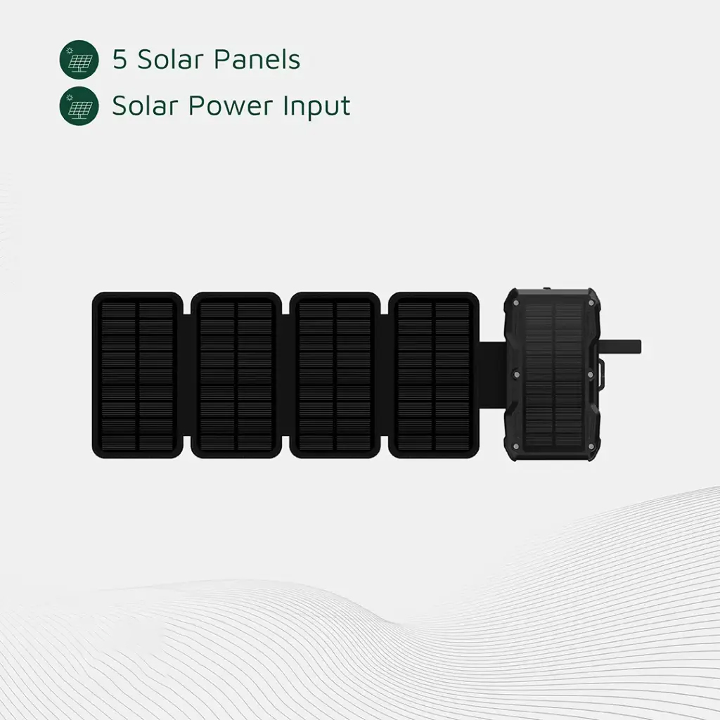 با وجود ظرفیت بالای باتری، طراحی تاشوی پنلهای خورشیدی (هر کدام با ابعاد 150×60 میلیمتر) باعث شده که دستگاه فضای زیادی اشغال نکند و به راحتی قابل حمل باشد. نمایشگر LCD روی بدنه نیز میزان شارژ باقیمانده را بهصورت دقیق نشان میدهد تا همیشه بدانید چقدر انرژی در اختیار دارید.