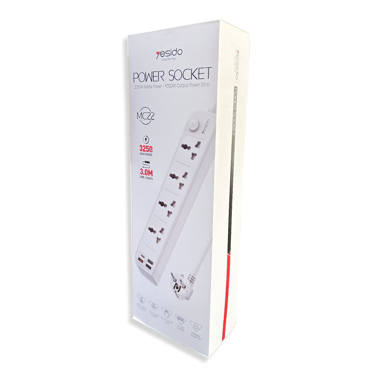 چند راهی برق یسیدو مدل YESIDO MC22دارای ابعاد 370*240*580 میلی متر و وزن 425 گرمی می باشد که از چهار عدد پریز برق 100~245 ولت 13 آمپر و چهار پورت USB که دو پورت آن AUTO ID و یک پورت آن فست شارژ و یک پورت TYPE C یا همان PD به همراه یک کلید پاور کوچک و یک کابل برق به طول 300 سانتی متر تشکیل شده.