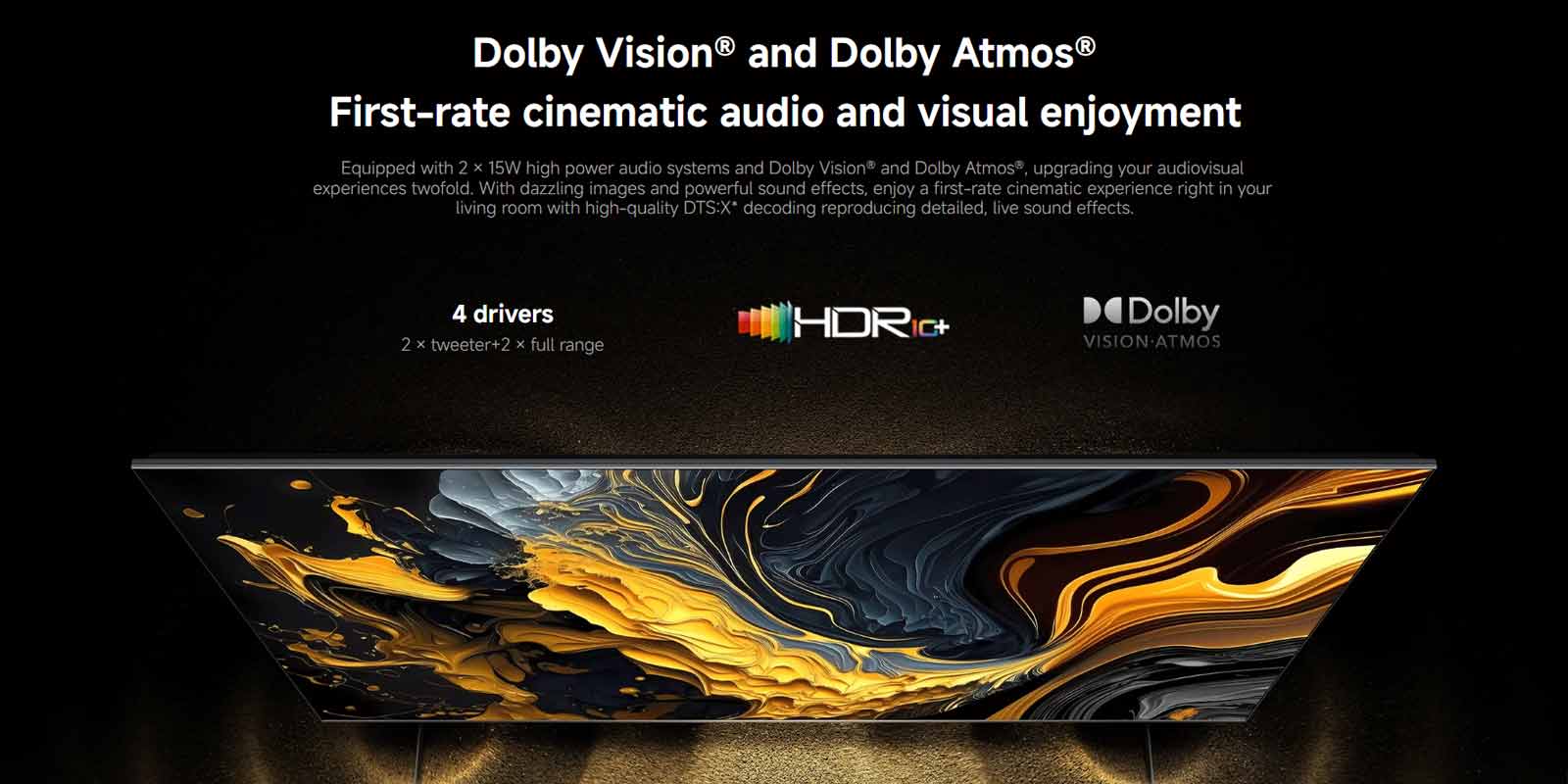 💥 تلویزیون Xiaomi TV Max 100 مجهز به سیستم صوتی چندکاناله و فناوری Dolby Atmos® + DTS-X است.