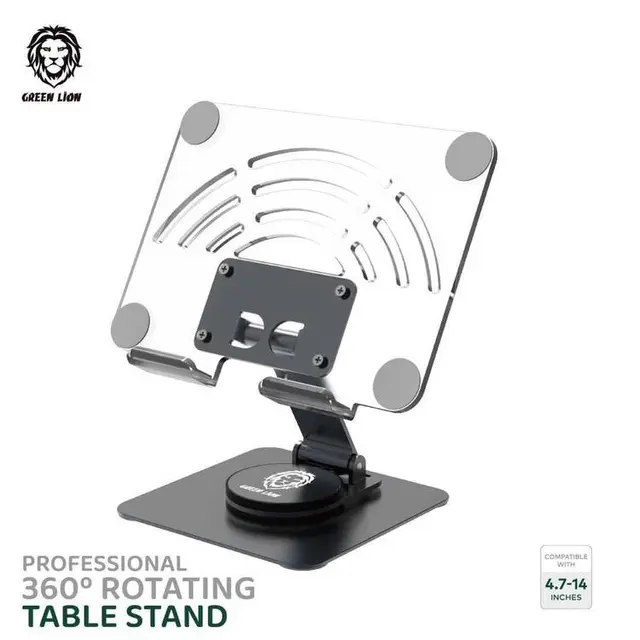 پایه رومیزی چرخان 360 درجه Green lion یک پایه دستگاه تاشو سبک و باریک است که با تمام دستگاه های 4.7 تا 14 اینچی از جمله تبلت و لپ تاپ سازگار است. این لوازم جانبی مفید و سبک وزن به دلیل چرخش 360 درجه و گردن قابل تنظیم، زاویه دید و تایپ ارگونومیک و راحتتری را برای کاربر فراهم میکند. پایه برد طراحی شده برای این مدل به بالا بردن لپ تاپ در یک زاویه خاص برای ارگونومی و جریان هوای بهتر کمک می کند.