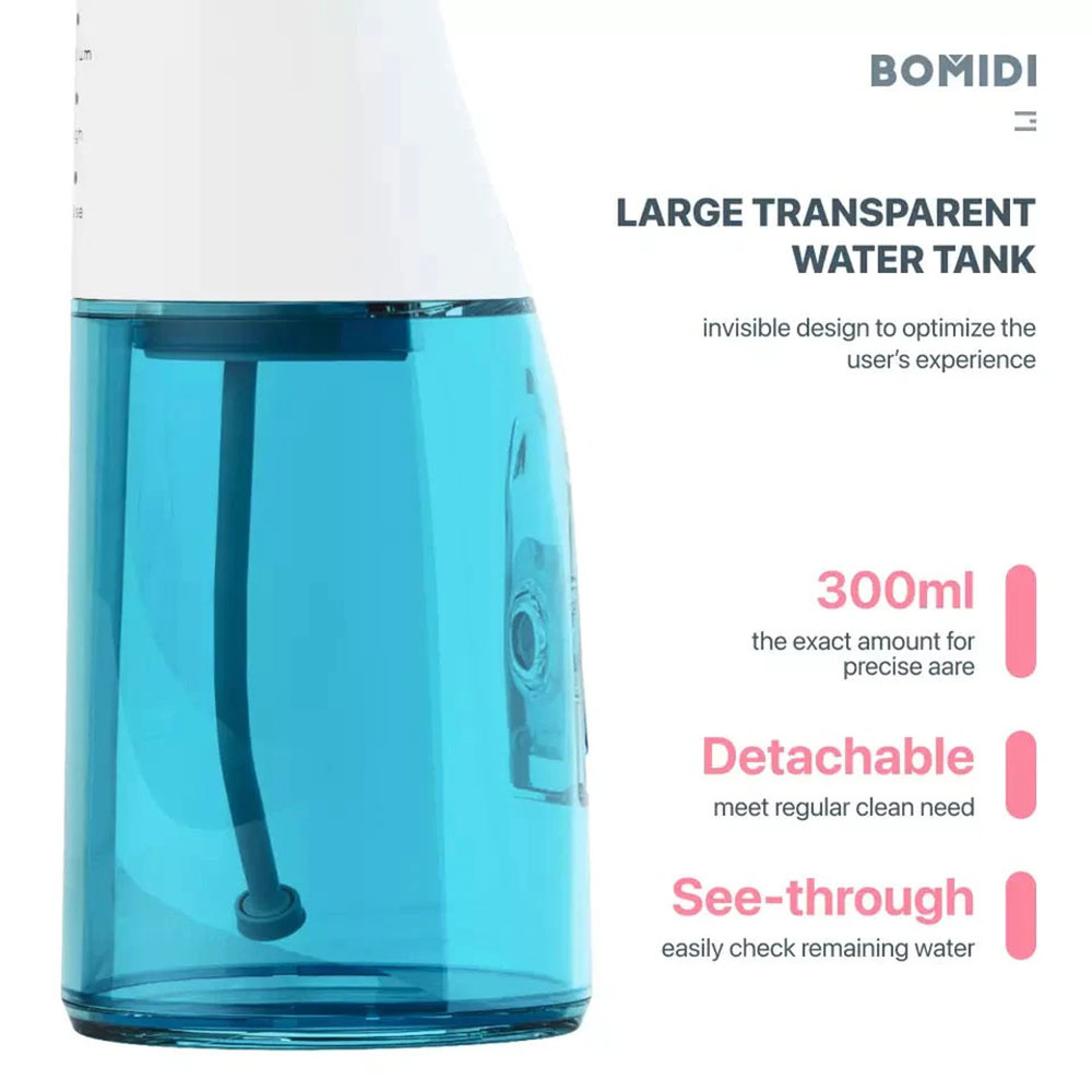 طراحی واتر جت دهانشوی شیائومی BOMIDI D3 Pro به گونه ای است که مخزن آب آن شفاف و بی رنگ است و شما می توانید میزان آب را در آن مشاهده کنید. مخزن آب واتر جت قابل شارژر Oral Irrigator D3 Pro BOMID 300 میلی لیتر بوده و که برای راحتی کاربر، در زمان خالی شدن آب، قابلیت جدا شدن را دارد و پس از پر کردن می توانید به واتر جت متصل کنید.