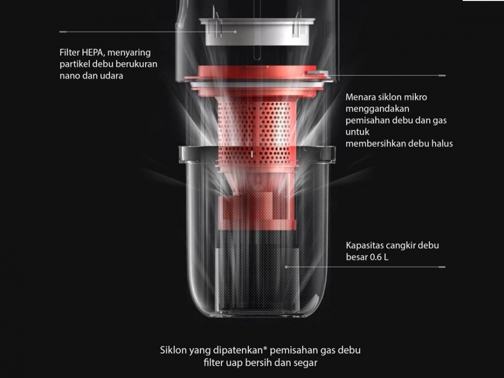 در مخزن جارو شارژی شیائومی درما مدل VC811 از دو فیلتر HEPA برای جمع آوری ذرات ریز میکرونی و فیلتر هوای میکرو استفاده شده که می تواند هوا را از گرد و خاک جدا کند. با کمک این فیلترهای دوگانه خاک ها با فرایند سانتریفیوژ به فیلترهای مشبک میچسبند تا هوای خروجی هیچ گردی را وارد محیط خانه شما نکند.