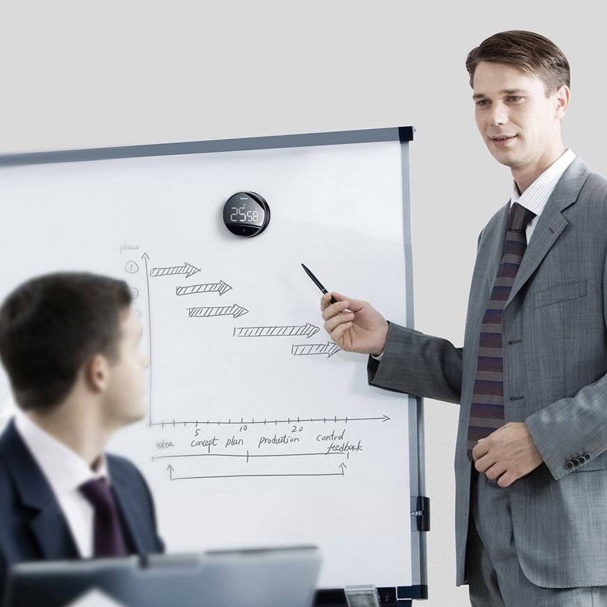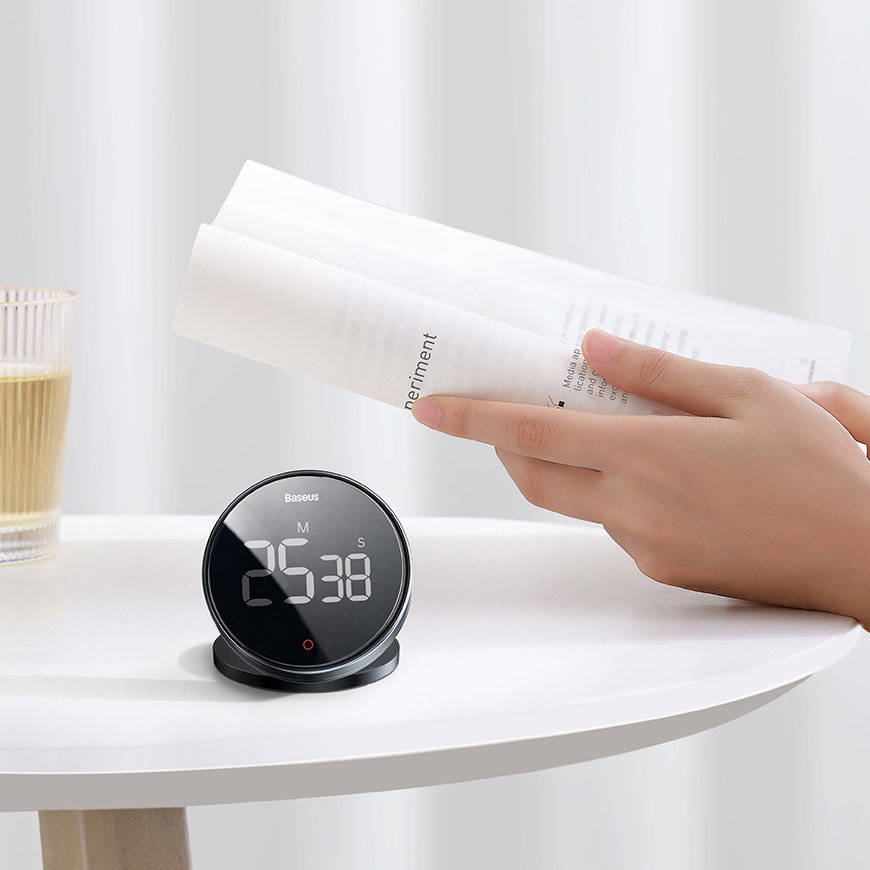 اما این تنها مزیت تایمر نیست، Baseus Timer Pro دارای یک پایه نیز هست که میتوان توسط آن، یک زاویه 80 درجه را برای باسئوس ایجاد نمود و سپس آن را با خیالی راحت روی سطوح صافی مانند میز و… قرار داد و از زمان اعلامی آن مطلع شد. صفحه نمایش تایمر یک صفحه LED با کیفیت HD Digital است. این تایمر برای کارهای مختلفی مناسب است، مثل زمان ورزش کردن، آشپزی و…