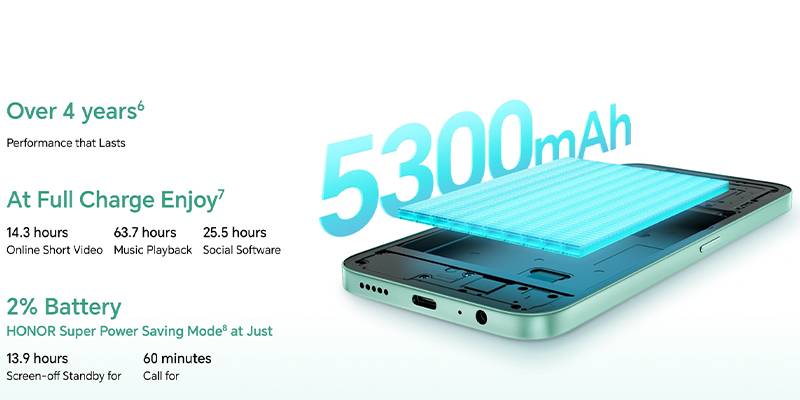 یکی از نقاط قوت اصلی Honor X6c ظرفیت بالای باتری آن است و این موضوع چندسالی میشود که به یکی از خصیصههای اصلی گوشیهای آنر تبدیل شده است. این گوشی به یک باتری ۵۳۰۰ میلیآمپرساعتی مجهز شده که در کنار پردازنده کممصرف و نمایشگر با رزولوشن پایین، میتواند تا یک روز و نیم یا حتی دو روز استفاده عادی را پاسخگو باشد. همچنین پشتیبانی از شارژ سریع ۳۵ واتی به این معناست که شارژ باتری در مدت زمان کوتاهی انجام خواهد شد. این ویژگی بهخصوص برای کاربرانی که وقت زیادی برای شارژ کردن ندارند، بسیار کاربردی است.