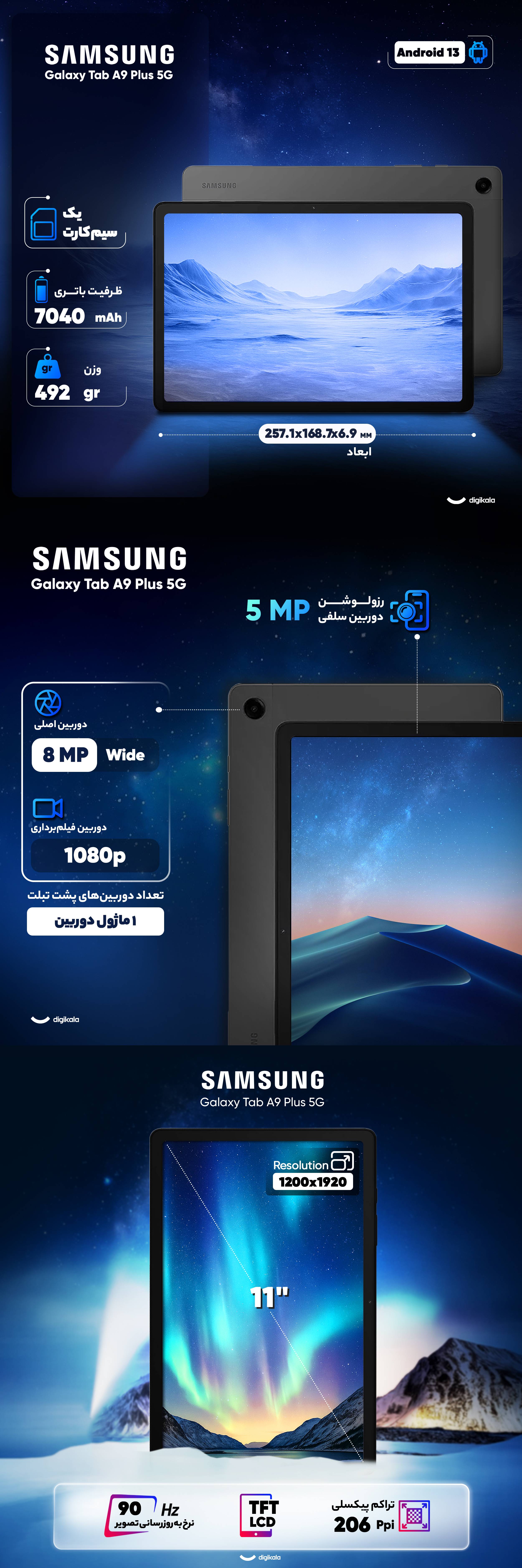 تبلت 11 اینچ سامسونگ مدل Galaxy Tab A9 Plus 5G با ظرفیت 64 گیگابایت و رم 4 گیگابایت، قابلیت پشتیبانی از یک سیم کارت و رزولوشن دوربین 8 مگاپیکسل، قابلیت تماس صوتی با سیمکارت