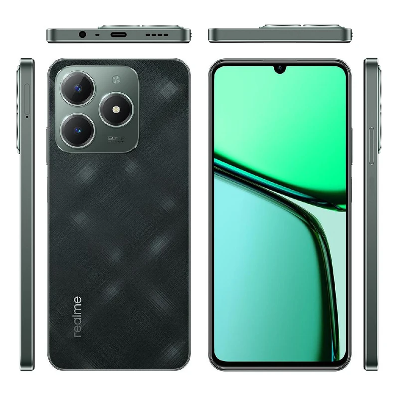 ریلمی C61 با ضخامت 7.8 میلیمتر و وزن 188 گرم، طراحی باریک و سبکی دارد که در استفاده روزمره حس راحتی را به کاربر منتقل میکند. قاب جلوی دستگاه از شیشه ساخته شده و فریم و قاب پشتی آن از پلاستیک هستند که به کاهش وزن گوشی کمک کردهاند. این دستگاه از استاندارد IP54 برخوردار است، که نشاندهنده مقاومت آن در برابر گردوغبار و پاشش آب است. طراحی ساده اما مدرن این گوشی در کنار حسگر اثر انگشت جانبی، تجربه کاربری آسان و ایمنی را فراهم میکند. قاب پشتی نیز با بافتی مات طراحی شده که از ماندن اثر انگشت جلوگیری کرده و زیبایی ظاهری دستگاه را حفظ میکند و به طور کلی میتوان به طراحی این گوشی نمره بالایی در دسته اقتصادیها داد. در بخش صفحه نمایش، ریلمی C61 به یک نمایشگر 6.74 اینچی IPS LCD مجهز شده است. این صفحهنمایش با نرخ بروزرسانی 90 هرتز، تجربهای روان در جابجایی میان منوها و گشت و گذار در فضای وب ارائه میدهد. این صفحه نمایش روشنایی 560 نیتی دارد که شاید خیلی درخشان نباشد، اما کم نور هم نیست و در این رنج قیمتی یک مزیت محسوب میشود. رزولوشن 720 × 1600 پیکسل و تراکم پیکسلی حدود 260 پیکسل در هر اینچ، کیفیت تصویر قابل قبولی را ارائه میدهد. اگرچه این رزولوشن در مقایسه با گوشیهای گرانقیمت محدود است، اما برای کاربران معمولی و در بازه قیمتی این دستگاه کاملاً مناسب است.