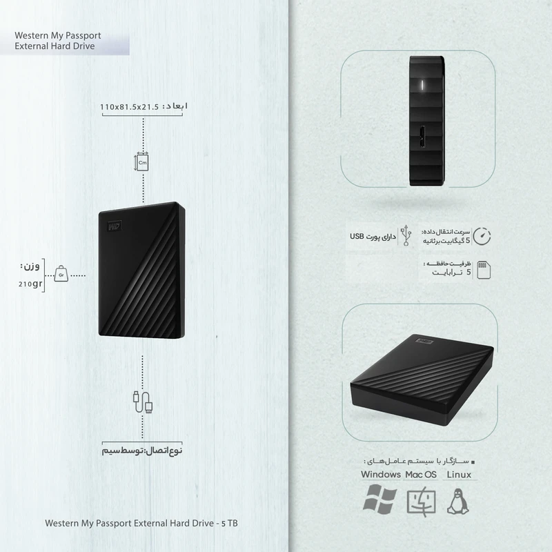هارد اکسترنال وسترن دیجیتال مدل My Passport با ظرفیت پنج ترابایت دارای رابط USB Type-A 3.2، سازگار با گوشی موبایل، تبلت، کامپیوتر و لپتاپ (ویندوز و مک) با سرعت چرخش 5400 دور در دقیقه، مقاوم در برابر خط و خش