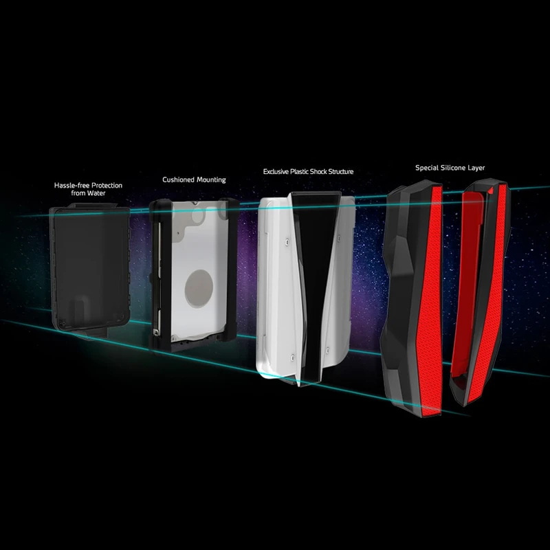 برای حفاظت بیشتر از هارد ای دیتا برای این مدل از 3 لایه استفاده کرده است. یک کیس سیلیکونی و یک بافر محکم و در نهایتاً کوسن از هاردتان محافظت میکند. استفاده از این سه لایه باعث شده تا نسبت به شوک و ضربه هاردتان مقاوم باشد. اگر هاردتان همیشه همراهتان است، این ویژگی کارایی بسیاری برایتان خواهد داشت.
