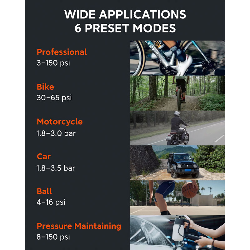 فقط کافی است حالت موردنظر را انتخاب کنید — پمپ بهصورت هوشمند تا فشار تعیینشده باد میکند و سپس بهطور خودکار خاموش میشود.