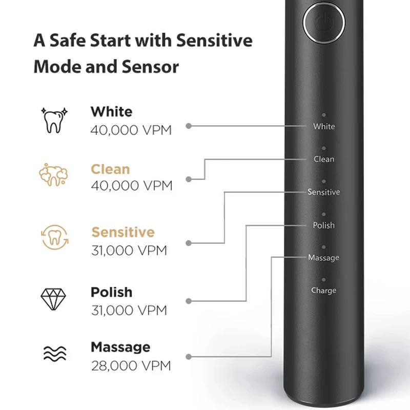 این مسواک با ۵ حالت عملکرد متفاوت طراحی شده تا با هر نوع دندان و لثهای سازگار باشد: