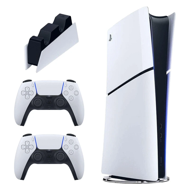 کنسول بازی سونی مدل PlayStation 5 Slim نسخه دیجیتال ریجن اروپا سری 2016B با ظرفیت حافظه داخلی 1 ترابایت به همراه یک عدد کنترلر اضافه به رنگ Robot White به همراه پایه شارژر کنترلر، حداکثر وضوح تصویر خروجی 4K