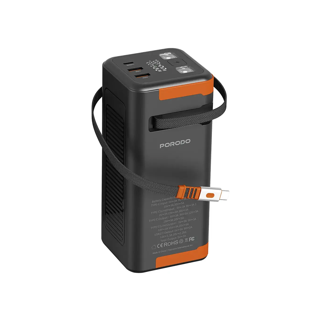 پاوربانک Porodo Power Boost 50000mAh یک منبع انرژی عظیم و مطمئن است که برای کاربرانی طراحی شده که همیشه به شارژ بیشتر نیاز دارند. با ظرفیت فوقالعاده ۵۰۰۰۰ میلیآمپر ساعت (185Wh)، این پاوربانک میتواند بارها گوشی، تبلت یا حتی دستگاههای پرمصرف شما را شارژ کند و همراهی ایدهآل در سفر، طبیعت یا شرایط اضطراری باشد.